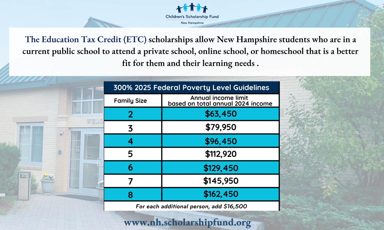Passed into New Hampshire Legislature in Summer 2021, this opportunity allows eligible families to direct part of their child's state education funding to pay for tuition and services at the school of their choice. Examples of services include tutoring and support, technology, school supplies, and uniforms.
